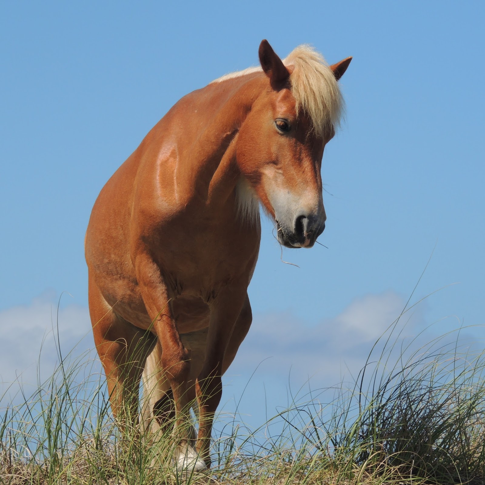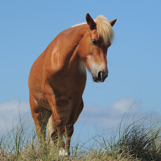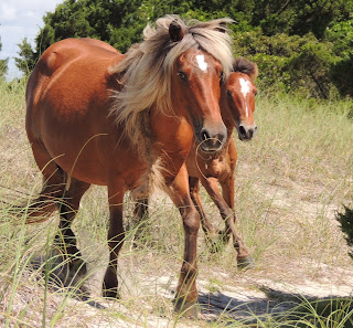 Here's the story. As the legend goes, in the 1500's, a Spanish settlement was attempted on the coast of North Carolina, with very few survivors. As ships continued to come this direction, they would either run aground, or land on the outer bank islands. Once here, the ships would abandon their livestock - including horses. This continued for decades, with horses being cast overboard or released from Spanish ships, for whatever reason. Today, hundreds of years later, the descendents of these early equestrine pioneers roam the banks of Shackleford Island, as free as their ancestors. They are lovingly referred to by the locals as "Bankers".